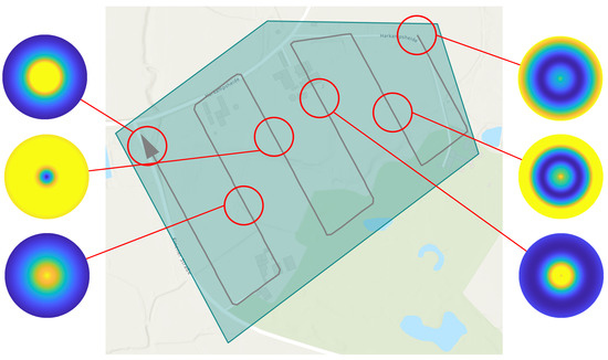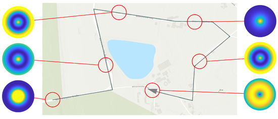 A PM represents the course of the detection performance (shaped as a potential field) in a 2-dimensional plane, which coincides with the plane of motion of the UAV in a fixed altitude above ground h a g l . For each individual sensor footprint, defined by coverage path planning in Section 2.1, an individual PM is created. Each PM is rotation symmetric and circular with diameter d p m (see Table 3) and with its center perpendicular above the center of the corresponding sensor footprint. The PM is obtained by selectively varying the sensor/UAV position in the 2-dimensional plane, which leads to a change in the elevation angle. The position of the sensor footprint permits the determination of the topographic state within the footprint using a geographic information system (GIS). Together with the atmospheric conditions prevailing in the PM, the detection performance can be calculated for the specific elevation angle using the sensor performance model. The atmospheric states are assumed to be constant within the individual PM due to their limited spatial extent. The variation of the UAV position also changes the length of the line of sight, which would result in a change of the GSD. Therefore, the field of view of the sensor is varied within its technical limits so that the GSD reference value (see Table 1) is maintained.