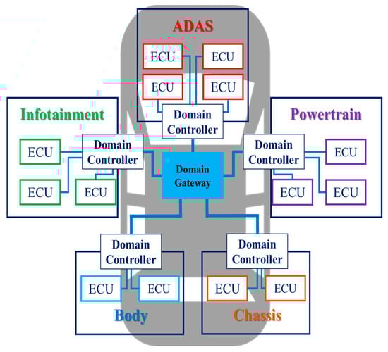Until 2019, vehicles used distributed IVN architecture with all ECUs connected to a central gateway [13,14]. This architecture is suitable as an IVN architecture for vehicles with a small number of ECUs and transferring and receiving small amounts of data. However, with the development of autonomous driving technologies, the number of ECUs mounted in vehicles is increasing more than in the past. In this architecture, communication takes place between all ECUs through a central gateway, which inevitably places a higher load on the gateway compared to other architectures. A high load on the gateway causes data losses and delays. Data losses and delays in autonomous vehicles can lead to serious traffic accidents. This architecture can increase the complexity of wiring and network as all ECUs are connected to a central gateway. As complexity increases, networking performance and time-sensitive communication speeds decrease.