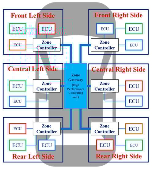 ZIA is an architecture that groups ECUs into zones based on physical proximity rather than grouping them according to similar functions. Figure 2 shows a ZIA that groups ECUs into six zones according to their physical location. As shown in the figure, one zone controller is placed in each zone, and a high-performance computing unit is placed in the center of the ZIA. DIA is a domain-centric IVN architecture, and ZIA is a centralized IVN architecture. In DIA, multiple domain controllers perform data collection, calculation, and control according to their functions, but in ZIA, a single high-performance computing unit performs all tasks. This unit works like a brain and also acts as a central gateway to pass data from one zone to another [13]. Autonomous vehicles require high-performance autonomous applications that collect data from multiple sensors, make situational decisions, and control the vehicle. Therefore, ZIA, which can perform collection, calculation, and control functions through a single high-performance computing unit, is suitable as an architecture for autonomous vehicles. The most significant advantage of adopting ZIA to vehicles is the simplification of communication networks and wiring harnesses [14]. As a result, ZIA can benefit from faster data processing and transmission than previous IVN architectures.