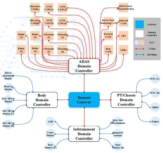 DIA designed in this paper consists of a domain gateway and four domain controllers. A 1 Gbps wired links were used to connect DIA backbone network and the ADAS domain controller and the ECUs. The red lines are the 1 Gbps wired links. Connections between other domain controllers and ECUs used the 100 Mbps wired link. The blue lines are the 100 Mbps wired links. The ECUs, which are closely related to autonomous driving, use the 1 Gbps wired links because they not only generate a large amount of time-sensitivity data but also transfer and receive data within a limited time. For example, CAMs generate more AV data than other ECUs. High-bandwidth links are required as road information collected via CAMs need to be quickly identified and time-sensitivity data transferred.