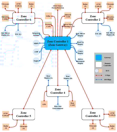 OEMs and vehicle component manufacturers present ZIAs that group IVN from a minimum of four to a maximum of 13 zones. Figure 4 is ZIA with automotive Ethernet that we designed. We design ZIA, which groups IVN into six zones. There are six zones: front left, front right, center, rear, rear left, and rear right. The number of ECUs included in ZIA equals the number of ECUs containing DIA designed in Figure 3. ZIA presented in this paper consists of six zone controllers. ZIA backbone network and autonomous driving-related ECUs were connected to nearby zone controllers using the 1 Gbps wired links. Other ECUs were connected to zone controllers using the 100 Mbps wired links. The red lines are the 1 Gbps wired links and the blue lines are the 100 Mbps wired links.