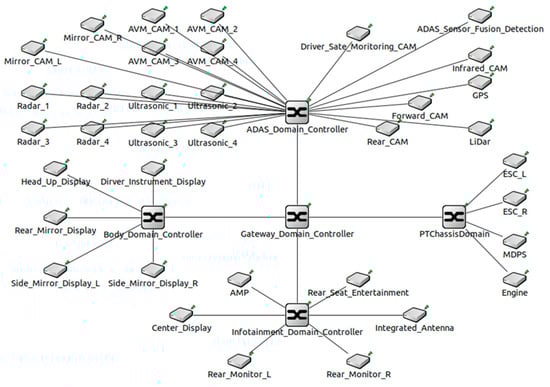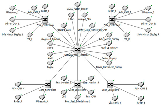 We develop DIA and ZIA simulators using the OMNeT++ (Ver.5.6.2) [23] and the open-source CoRE4INET framework [24]. The CoRE4INET framework provides functions conforming to the Ethernet AVB Gen 1 and Gen 2 standards using the INET framework. Figure 5 shows DIA developed using the OMNeT++ to simulate a previously designed DIA. This DIA is an IVN architecture grouped into four domains according to functions. Figure 6 shows ZIA developed using the OMNeT++ to simulate a previously designed ZIA. This ZIA adopts a star topology and is an IVN architecture grouped into six zones according to physical locations of ECUs.