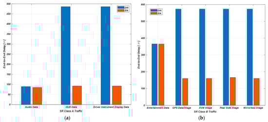 Comparison of E2E delays for the SR Class A and B. (a) E2E delays for the SR Class A; (b) E2E delays for the SR Class B.