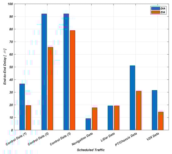 Figure 8 compares the E2E delays for the ST with the highest priority in DIA and ZIA. The E2E delay for the control data (1) is 36.68 in DIA and 19.52 in ZIA. The E2E delay for the control data (2) is 92.13 in DIA and 65.65 in ZIA. The E2E delay for the control data (3) is 92.15 in DIA and 78.9 in ZIA. The E2E delay for the PT and chassis data is 51.05 in DIA and 30.89 in ZIA. The E2E delay for the V2X data is 31.51 in DIA and 14.34 in ZIA. However, the E2E delay for the navigation data is 9.16 in DIA and 17.74 in ZIA. Finally, the E2E delay for the LiDar data are the same for DIA and ZIA. We verified that the E2E delays for five out of seven data be shorter in ZIA than in DIA through simulation.