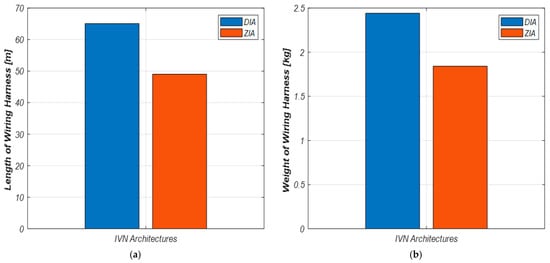 Comparison of the total length and weight of the wiring harness for the two IVN architectures designed in this paper. (a) Comparison of the total lengths of the wiring harnesses for DIA and ZIA; (b) Comparison of the total weights of the wiring harnesses for DIA and ZIA.
