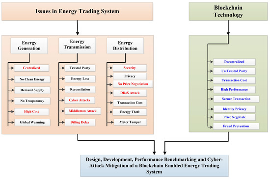 There has been a rapid global population growth during the past few decades. Some even go so far as to call electricity a “necessity” for human survival. In order to strike a balance between supply and demand, we have relied on conventional power plants such as those that run on fossil fuels up to this point. Reducing reliance on fossil fuels, restricting grid expansion, and bolstering innovative technology are all pressing issues in the energy business. Thus, the electricity supply, transmission, and distribution sectors have had to deal with rising consumer demand throughout the years [1,2,3,4]. To balance the rising demand and limited supply, renewable energy sources such as solar are rising to the forefront. Keeping track of all the many players, utilities, manufacturers, customers, etc., adds another layer of complexity. Centralized ledgers have traditionally been used to record transactions between players in the energy market; but, as the market evolves, these ledgers have become increasingly inefficient, slow, cumbersome, and expensive to use. Because of this, numerous tasks, such as monitoring energy demand and supply, ensuring the safety of producers and consumers, calculating costs, and settling payments quickly, necessitate a substantial investment of time and energy [3,5]. Sometimes, security breaches can occur due to a lack of responsibility in the power industry, which can lead to a number of different types of errors [6,7,8]. The issues in peer to peer energy trading system, from generation to transmission to distribution, are shown in Figure 1.