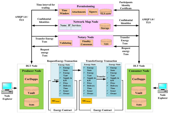 In this section, a Corda blockchain-based P2P energy trading application is proposed on various DLT nodes with notary, signer permissioning, confidential identities in network map node, and energy trading contract to handle request, transfer commands, as depicted in Figure 2. For the proposed framework on a Corda network, we consider two parties, producer (trader A), consumer (party B) and matching notary. The matching notary is one to whom the energy will be requested from party A and then it transfers to party B after verifying the trading rules and data in the energy contract and attachment. To achieve this we consider an energy state and an energy contract and a flow called requestEnergy flow. Once the party A requests energy, we can have another flow, called transfer energy flow, to party B. We can have any number of producers and consumers on the network and they can transfer energy state to each other back and forth as many times as they like. We considered number of attributes on energy state such as energy type, demand and supply in KW, time of delivery, price per KW, issuer, and owner. For an issuance transaction it will have no input, one output, it only accepts if energy is solar or wind, and a producer signature. Thus, when the flow is completed we would have the energy state in the producer’s, notary’s, and consumer’s vaults. Now that the producer is owner of the energy state, he would be able to transfer energy flow, which takes the output of the previous transaction as input for this transaction and sends it to consumer. Though it is a transfer energy transaction flow, both consumer and matching notary sign the transactions. The energy contract has separate rules for transfer command. Once the transfer energy flow is completed, we received the energy state being used as input to be marked as consumed in both producer and notary vault, and a new energy state is created in the consumer vault, which will be unconsumed, and the owner for that energy will be the consumer. Similarly, the payment state and transactions are designed in the framework. The other entities in the proposed network are discussed below.