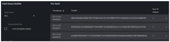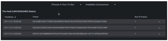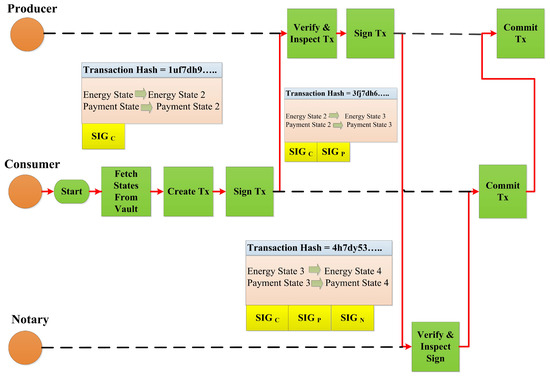 - Transactions: The first transaction would have zero inputs, i.e., X does not have energy in the DLT. X is issuing energy, so there is no input state and one output state in the first transaction. Since producer and consumer are both participants in the transaction, they both need to input their signature, as shown in Equation (15).After one or two transactions, the vault represents the unconsumed and consumed energy amount along with the payment state. The payment state needs to be signed by the consumer, as shown in Equation (16).For each transaction, a unique transaction hash is generated. Index is the count of the state.