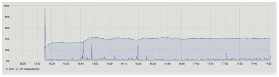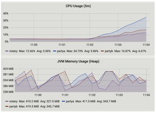 The summary of the performances measured for our proposed framework are illustrated in Table 3. In Table 3 the node name, flows started and completed, CPU and JVM memory usages, and flow duration are measured. Figure 6 and Figure 7 represent the CPU usage along with JVM memory usage at 15 min and 1 h of up-time. The Corda node maintains the number of caches. Basically, there are two types of cache in the Corda network, i.e., size- and weight-based. The producer, consumer, and notary JVM memory usage are presented. The notary takes more JVM memory usage compared to producer (party A) and consumer (party B). The CPU usage metric monitors the CPU load and overhead parameter of the network and returns an alert if high CPU measurements are found, as shown in Figure 8. The CPU usage is also shown in Figure 6 and Figure 7, where we found that the producer and consumer CPU usage is lower compared to the notary.