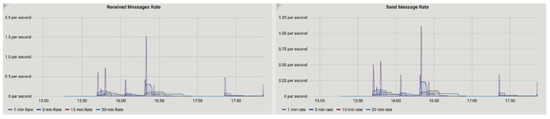 The peer-to-peer metric is used to measure the messaging sequence between two parties, such as producer and consumer in our proposed application. It also measures the latency by calculating the number of messages sent and received between two parties. The size and interval of the sent and received messages are also obtained. Figure 9 represents the latency histogram of received and sent messages between energy participants. We found that after 15:30 (min:s) the receive and send latency between nodes is high, i.e., 115 ms and 105 ms, respectively, but it gradually decreases and the average measured are 22 ms and 51 ms for send and receive message latency.