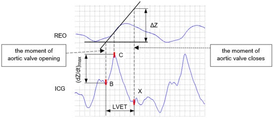 The values of and LVET necessary to estimate the stroke volume can be determined based on the positions of the characteristic points B, C, and X located on the first derivative of the bioimpedance curve (ICG) [58].