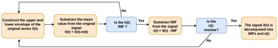 - The whole procedure of this sifting process ends when a residual signal is found. If the criterion of being residual sequences is not fulfilled yet, the procedure is repeated from step 1 with a residuum as an input series. A diagram of the main standard EMD stages is presented in Figure 3.
