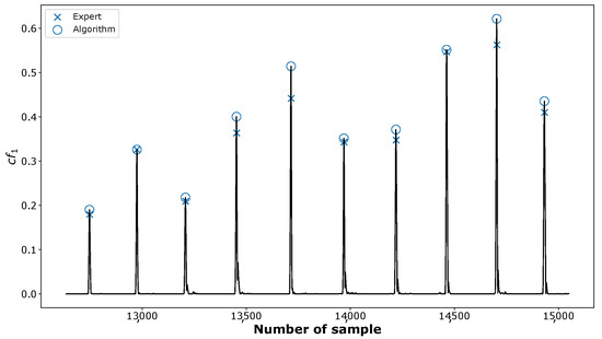 The positions of the C peaks marked in the combination of IMFs identified by an expert (crosses “×”) and detected by the proposed algorithm (circles “o”).