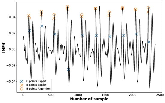 As for the B point, corresponding to the moment of aortic valve opening, it can be identified as the first maximum preceding C point in the first derivative of the fourth-order component obtained from the EEMD (see Figure 7).