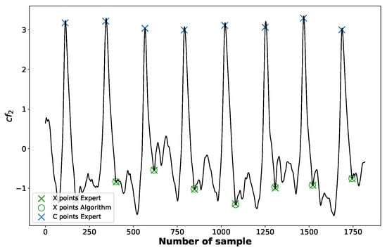 where C is the position of the C point in the current cycle and denotes the mean difference between two consecutive C points (mean heart rate). The function along with the marked positions of X points identified by the algorithm is depicted in the Figure 8.