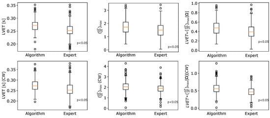 The statistical package in version of 14.0.0.15 together with the open source libraries dedicated to Python were used for the data analysis. The hypothesis about the normal distribution of analyzed variables was verified via the Shapiro–Wilk formula at the significance level . For the investigation of the statistical significance of differences, the t-test and its non-parametric equivalent in the form of the Mann–Whitney U statistic were used. Figure 10 summarizes the statistical comparison of the hemodynamic parameters obtained by the algorithm and marked by an expert in cardiology. For the vast majority of cases, the determined p-values calculated for the Shapiro–Wilk test were less than the assumed significance level . For that reason, box–whisker plots characterizing the respective quartiles are presented instead of the average values with the standard deviations. The subplots compare the median values of selected hemodynamic parameters obtained by the algorithm and the expert. Although the changes between respective groups (expert vs algorithm) are relatively small, according to the Mann–Whitney U formula, there exist statistically significant differences between the compared cases at the selected significance level (the p-values are highlighted in each subplot). The values of selected hemodynamic parameters determined by the EMD-based algorithm are slightly overestimated compared to the results indicated by the expert. Table 4 characterizes the differences between median values of the compared parameters estimated by the algorithm and an expert. To assess what kind of characteristic points could mostly affect the differences between the algorithm and the expert, the accuracy values were calculated and presented in Table 5. Following [74], is considered the tolerance between positions of points annotated by the expert and those identified by the algorithm. A good agreement can be observed for the B and C points (significantly above ). Simultaneously, our results suggest that X is the most difficult point to determine automatically. Compared to other algorithms of characteristic point determination in ICG signals, the agreement with the expert is also the smallest in the case of the X point.