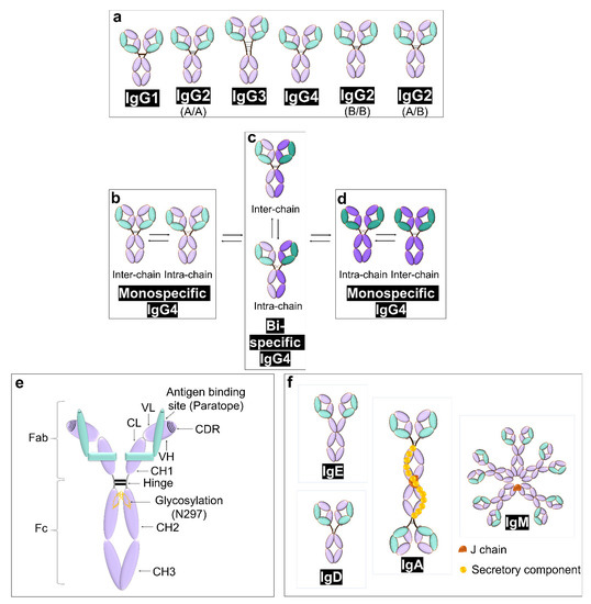 Extensive research in the 20th century led to the discovery of IgG subclasses in the 1960s by using rabbit antisera specific to human IgG myeloma proteins [3,7]. Although there is a 90% similarity between IgG subclasses at an amino acid level, they differ with respect to their antigen binding event, half-life, formation of immune complex, placental transport, and effector cell triggering [14]. The detailed differences in the structure of IgG subtypes and allotypes have been shown in Figure 2a–d along with regions and various components of IgG (Figure 2e), and schematics for the structure of other immunoglobins (IgE, IgD, IgA, and IgM) have also been shown (Figure 2f).