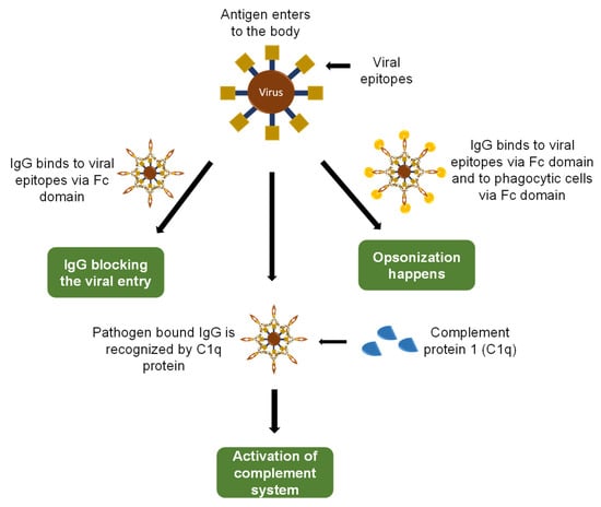 The first mechanism is the neutralization of the pathogen’s ability to enter host cells, and toxins are stopped to enter the host cells. IgG binds itself to viral epitopes via Fab domain. This event is responsible for the blockage of vial entry, fusion, and maturation inside the host cells. The second mechanism is the binding of antigen-bound IgG with phagocytic cells, which leads to the ingestion of both viral particles and phagocytes; this mechanism is known as opsonization. The last mechanism involves the recognition of antigen-bound IgG molecules by complement proteins (Cq1) and activation of complement system, which leads to virus eradication.