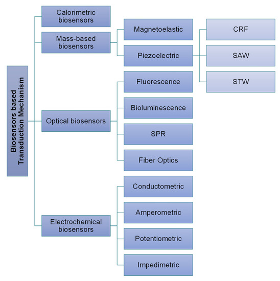 - Transducer: Transducers help in the conversion of the biorecognition phenomenon into a measurable output signal, and this process is known as the transduction mechanism or signalization. Based on multiple transduction events happening in various biosensors, they have been classified as shown in Figure 5 [39].