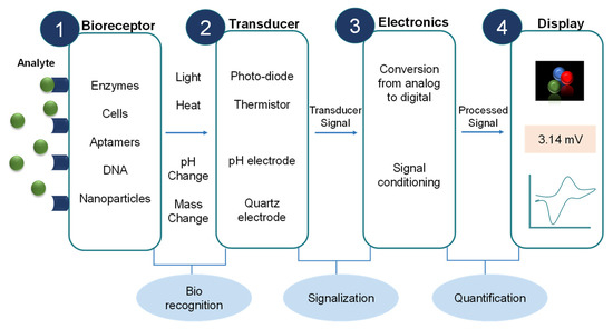 Figure 6. The components and working principle of a typical biosensor represent levels of components, the types of components, and the purpose of each level. For instance, a bioreceptor is a component with types, such as aptamers, enzymes, etc., with the purpose of biorecognition. Adapted from [37].