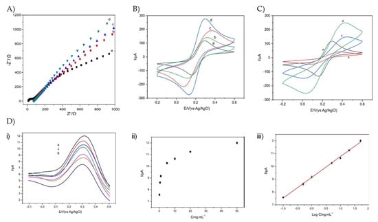 In figure (A–C), the samples were bare GCE (a), MoS2/GCE (b), MoS2@N− GQDs/GCE (c), and MoS2@N−GQDs−IL/GCE (d), giving different Nyquist plots in (A) and voltammograms in (B) and (C). In (D) (i) shows the differential pulse voltammograms with varying concentrations of MIPs NPs/MoS2@N−GQDs−IL/GCE electrode in PBS while in (D) (ii,iii) shows the calibration curves for human IgG at MIPs NPs/MoS2@N−GQDs−IL/GCE. Results were used with permission from [57].