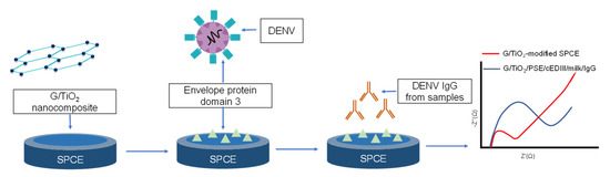 An impedimetric sensor for detecting DENV IgG proteins using G/TiO₂/PSE-modified nanocomposite. The graph represents a Nyquist plot with the red indicating G/TiO₂-modified SPCE and the blue indicating G/TiO2/PSE/cEDIII/milk/IgG. Used with permission from [86].