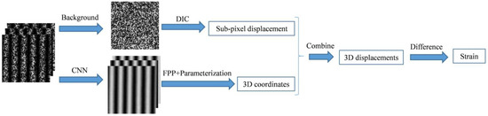 A flow chart of the proposed measurement method is shown in Figure 1. Firstly, speckle images are extracted from the background light grey intensity of the phase-shifting fringe images. DIC is applied to calculate the sub-pixel displacement of the measured object before and after deformation. At the same time, high-quality fringe images are separated from the speckle-embedded fringe images using CNN. The 3D coordinates of the measured object before and after deformation can be obtained via FPP and the parameterization results of the system. Secondly, the least-squares method is used to solve the integer pixel 3D coordinates before deformation and the 3D coordinates corresponding to the sub-pixel after deformation. The 3D displacement can be achieved by subtracting the corresponding 3D coordinates. At last, the difference method is used to solve the full-field strain. It is necessary to establish local coordinate systems. The 3D coordinates before deformation and 3D displacement are converted to the corresponding local coordinate systems, and the strain tensor can be obtained by fitting the 3D displacement in the local system. The above contents will be introduced in the following four subsections.