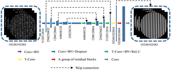 As shown in Figure 3, a U-shaped convolutional neural network (CNN) structure with great feature extraction performance is constructed [23]. Three-step phase-shifting speckle-embedded fringe images are used as the input of the CNN, while speckle-free fringe images are used as the output of the CNN. The U-shaped structure is divided into two parts: feature extraction and feature fusion. The feature extraction part consists of the following operations: convolution (Conv) and batch normalization (BN), and Conv, BN and Dropout by four times. The feature fusion part consists of the following operations: transposed convolution (T-Conv), BN and rectified linear unit (ReLU) by four times; T-Conv; and a group of residual structures and Conv. At the same time, in order to retrieve the missing information, the method of skip connection is used to connect the high-level information and the low-level information to achieve pixel-level information acquisition. The residual block structure includes Conv, residual block and Conv. This structure alleviates the gradient disappearance problem caused by increasing the depth in neural networks.
