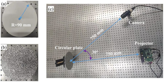In Figure 4, the experimental system includes a DLP projector (LightCrafter 4500, Manufacturer Texas Instruments, Headquartered in Dallas, TX, USA) with a resolution of 912 × 1140 pixels2, and an IDS UI-3370CP (Manufacturer IDS, Headquartered in Obersulm, Germany) camera with a resolution of 2048 × 2048 pixels2 and that operates at 80 frame rates per second. A customized acrylic circular plate is employed as the measured object in the experiment, with a radius of 90 mm. The distances from the camera and projector to the circular plate are about 750 mm, and the angle between the camera and the projector is about 30°.