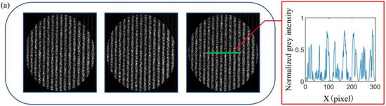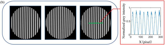 In Figure 5, (a) shows the input fringe images of CNN and grey intensity at the green line, and (b) shows the fringe images predicted by CNN and grey intensity at the green line. It is obvious that CNN can effectively separate fringe images and improve the quality of the fringe images.