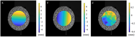 The corresponding relationship before and after rotation can be found using the DIC algorithm according to Section 2.3. The fitting subset window area is 29 × 29 pixels2. According to Equations (5)–(8), polynomial fitting is performed to find the corresponding 3D coordinate relationship before and after rotation. The displacement in the three directions can be obtained by subtracting the 3D coordinates of the corresponding points. The full-field displacement in the three directions are shown in Figure 7.