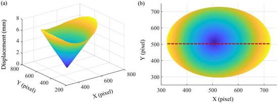 Speckle images can be obtained from the background grey intensity of the phase-shifting speckle-embedded fringe images. The circular area in the middle of the circular plate is selected as the calculation area. As shown in Figure 6, (a) shows x-direction displacement of the circular plate along the y direction in the image, and (b) shows y-direction displacement of the circular plate along the x direction in the image. Their units are pixels.