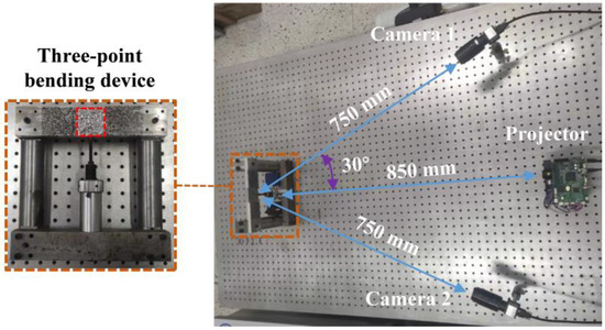 Strain reflects the relative deformation of an object under stress. It is an essential physical quantity used to measure the mechanical properties of objects. As shown in Figure 10, camera 1 and the projector form FPP combined with a DIC measurement system. Camera 1 and camera 2 constitute a 3D-DIC measurement system. They are placed symmetrically about the projector. The distance from camera 1 to the three-point bending specimen is about 750 mm. The distance from the projector to the three-point bending specimen is about 850 mm. The angle between camera 1 and the projector is about 30°. Two methods are used to measure the strain in the red dotted area of the three-point bending specimen.