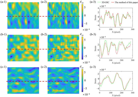 Since it is impossible to know the changes of the surface below the measured surface, only Ԑxx, Ԑxy and Ԑyy can be calculated. Figure 11a1,b1,c1 are the full-field strain distribution calculated using 3D-DIC, Figure 11a2,b2,c2 are the full-field strain distributions calculated using the method of this paper, and Figure 11a3,b3,c3 are the strain solved using two methods at the red dotted line. By comparison, the distribution of full-field strain calculated in this paper is basically the same as that calculated using 3D-DIC. The strain difference between the two methods is only 1 × 10−4. Therefore, this method can measure accurate strain results.
