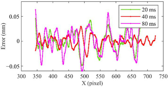 Figure 13 shows an error comparison of 3D displacement of a line under the exposure times of 20 ms, 40 ms and 80 ms. It can be clearly seen that the error reaches ±0.05 mm with high and low exposure. In Table 1, the RMSE of displacement measured with low exposure time (20 ms) is 0.02 mm, the RMSE measured with normal exposure (40 ms) is 0.01 mm, and the RMSE measured with high exposure (80 ms) is 0.03 mm. Therefore, the method presented in this paper can be used to measure both high- and low-exposure experimental scenes and has high accuracy.