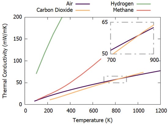 A plot showing how the thermal conductivity of air, carbon dioxide, hydrogen and methane vary with temperature. Inset—detailed view of where air and carbon dioxide intersect.