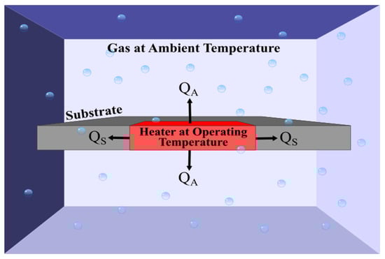 The simplest thermal conductivity gas sensing method employs a direct current operation. The most basic DC technique is based upon Fourier’s Law, which states that the heat transfer through a material is proportional to both the area and the negative gradient in the temperature. This is illustrated in Figure 2 using a recently developed thermal conductivity detector as a reference [5], where is the heat transfer from the heater into the surrounding medium through conduction and convection.