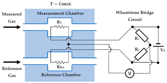 The principle of operation is based upon the same mechanism outlined for TCDs, except the thermal conductivity value is dependent on the difference between two resistors; one which has been exposed to the gas under investigation and one that is exposed to a reference gas (usually air). Figure 5 is an illustration showing the working principal behind a thermal conductivity pellistor. Here, it can be seen that one resistor is exposed to the gas under investigation and the other is exposed to a reference gas. The two outputs are connected to a Wheatstone bridge which measured the resistance difference. Thus, when both resistors are exposed to the same gas, they will lose heat at the same rate which will result in the output of the bridge being zero. When the measurement resistor is exposed to a target gas of different thermal conductivity, this will exhibit a different heat loss, causing a different voltage and creating unbalance in the bridge which can be measured.