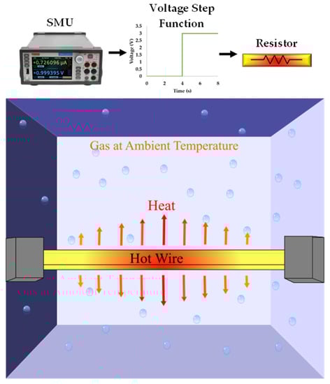 In Equation (10), the left-hand side represents the rate of heat generation due to electrical phenomena whilst the right-hand side describes the transient temperature change in the wire coupled with the conductive heat transfer into the . This shows that is the property of the gas medium that effects the heat dissipation from the hot wire. The time-resolved temperature solution can be obtained from Equation (10) by using the solution of being , resulting in