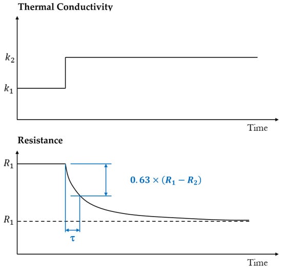 From this equation, it is shown that the heating time constant is inversely proportional to the thermal conductivity of the gas, illustrating the fundamental methodology of measuring thermal conductivity through this method. The hot wire resistance is dependent on the average temperature and thus its resistance is expected to behave exponentially during heating. The time constant process is graphically illustrated in Figure 7.