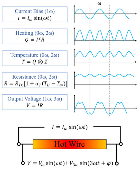 The output voltage can be described by Equation (20) where the 3ω voltage component results from the multiplication of the oscillating current with the periodic heater resistance