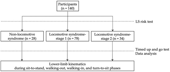 The participants performed the LS risk test to divide them into the non-LS, LS-stage 1, and LS-stage 2 groups (Figure 1). The LS risk test, performed following the JOA guidelines, consists of three parts: the two-step test, the stand-up test, and the 25-question Geriatric Locomotive Function Scale (GLFS-25). In the two-step test, the length of two steps from the starting line to the tip of the toes was measured [22]. The score was calculated by normalizing the maximum length of the two steps by height. In the stand-up test, the ability to stand on one or both legs from a 40 cm, 30 cm, 20 cm, or 10 cm high seat was measured [23]. Results are reported as the height of the smallest seat from which the participant could stand. The GLFS-25 is a comprehensive self-report questionnaire that refers to the previous month [24]. The scale includes 4 questions on pain, 16 questions on the activity of daily living, 3 questions on social functioning, and 2 questions on mental health status. Each question is rated from no disability (zero points) to severe disability (four points). LS-stage 1 is defined as a score of less than 1.3 on the two-step test, having difficulty standing up on one leg (or either leg) from a 40 cm high seat, or a GLFS-25 score of seven or higher. LS-stage 2 is defined as a score of less than 1.1 on the two-step test, having difficulty standing up from a 20 cm high seat using both legs on the stand-up test, or a GLFS-25 score of 16 or higher. In this study, the participants who met these criteria for LS risk stage 1 or 2 were defined as the LS-stage 1 or LS-stage 2 groups, and other participants were defined as the non-LS group [25].
