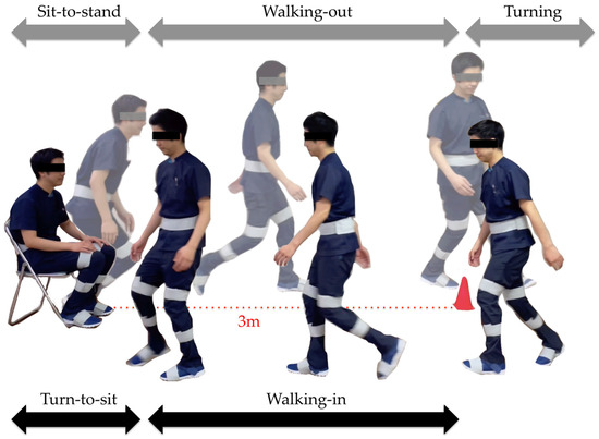 A standard armless chair (height: 45 cm) was placed, and the point of return was indicated on the floor 3 m away from it. To enable the motion start determination by the H-Gait system, the participants held a sitting position for about 10 s before performing the TUG test. To clarify the endpoint of the TUG, the participants were instructed to hold the sitting posture for about three seconds after sitting and then return to the static standing posture. In the TUG test, the participants were instructed to stand up, walk to the point of return, turn 180°, walk back to the chair, turn 180°, and sit down again. The participants were instructed to walk at their maximum walking speed for all trials. Each participant was allowed one familiarization trial, and two main trials were performed. The trial with the shorter TUG completion time was used for analysis.