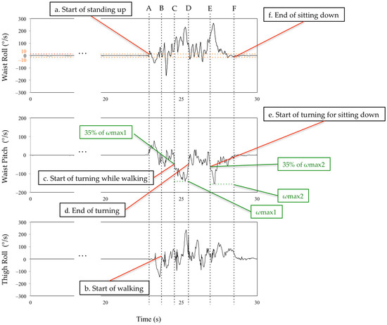 The subtask identification classifies subtasks into five classes: sit-to-stand, walking-out, turning, walking-in, and turn-to-sit phases [28] (Figure 5). Waist and thigh gyro sensors were used for this classification [29] (Figure 6). During the sit-to-stand phase, the start of standing up was defined as the output of the waist gyro sensor in the roll direction exceeding 10°/s (Figure 6: a). Concerning the walking-out phase, the start of the walking-out phase was defined as the output of the thigh gyro sensor in the roll direction exceeding 10°/s (Figure 6: b). The end of the walking-out phase was defined as the point at which the waist gyro sensor in the roll direction exceeded 35% of its regional maximum absolute value (Figure 6: c), and the total walking-out phase was defined as b, c in Figure 6. The regional maximum absolute value after the start of walking was defined empirically (Figure 6: ωmax1) because the walking-out distance is only 3 m. Therefore, the start of the walking-out phase and the start of the turning phase occur in a short interval of time. Considering the turning phase (Figure 6: c, d), the start of the turning phase was defined as the same time as the end of the walking-out phase, and the end of the turning phase was defined as the point where the angular velocity is below 35% of the maximum angular velocity of the waist gyro sensor in the roll direction (Figure 6: d). Concerning the walking-in phase (Figure 6: d, e), the start of the walking-in phase was defined as the same time as the end of the turning phase, and the end of the walking-in phase was defined as the point where the angular velocity exceeded 35% of the regional maximum angular velocity of the waist gyro sensor in the roll direction (Figure 6: e). The regional maximum absolute angular velocity of the waist gyro sensor in the roll direction was empirically calculated considering the obvious fact that the start of turning for sitting down takes place before the end of sitting down (Figure 6: ωmax2). The end of the turn-to-sit phase occurred when the roll angular velocity in the waist gyro sensor was below 10°/s (Figure 6: f), and the turn-to-sit phase was defined as e, f in Figure 6. TUG completion time was calculated as the interval from a–f in Figure 6.