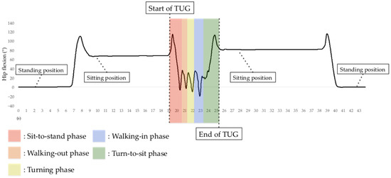 In addition to measuring TUG test completion time, we measured the time for all TUG subtasks. The H-Gait system generates lower-limb kinematics on both lower limbs for all TUG subtasks except for the turning phase. The H-Gait system was developed for walking in a straight line. We failed to evaluate lower-limb kinematics for the turning phase since our drift removal method is not available for the turning phase. Therefore, in this study, only four phases were analyzed, excluding the turning phase. Figure 7 shows the hip flexion angle during the TUG test.