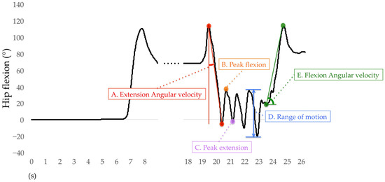 Only the right lower limb results are used for analysis. For the sit-to-stand phase, the average angular velocities of hip extension, knee extension, and ankle plantar flexion were calculated. The average angular velocity of the hip extension was the difference between the peak hip flexion to the peak hip extension during the sit-to-stand phase divided by time (Figure 8A) and also for the knee and ankle joints. During the walking-out phase, the mean peak angles of hip flexion, hip extension, knee flexion, knee extension, ankle dorsiflexion, and ankle plantar flexion were calculated. The H-Gait system divided the TUG test into gait cycles and calculated the angles of each joint for every gait cycle. One gait cycle was defined from the heel contact to the next heel contact was normalized to 100%. The heel contact timings were detected using the peak angular velocity data of the shank. The mean peak flexion and extension angles of the hip, knee, and ankle joints for each gait cycle are shown in Figure 8B,C. If two or more gait cycles occurred during the walking-out phase, these peak angles were averaged and retained for analysis. The mean range of motion (ROM) of the hip, knee, and ankle joints was calculated during the walking-in phase. The ROM was defined as the difference between the maximum and minimum flexion angles of each joint. The hip ROM for each gait cycle was calculated during the walking-in phase, as shown in Figure 8D, as well as for the knee and ankle joints. For the turn-to-sit phase, the average angular velocities of hip flexion, knee flexion, and ankle dorsiflexion were calculated. The average angular velocity of hip flexion was the displacement of the peak hip extension to the peak hip flexion during the turn-to-sit phase divided by time (Figure 8E) and also for the knee and ankle joints.