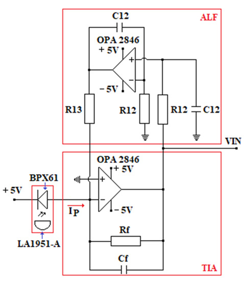 - OPA2846 Dual, Wideband, Low-Noise, Voltage-Feedback Operational Amplifier, Technical data sheet, Texas Instruments, 2008. Available online: www.ti.com (accessed on 31 January 2021).