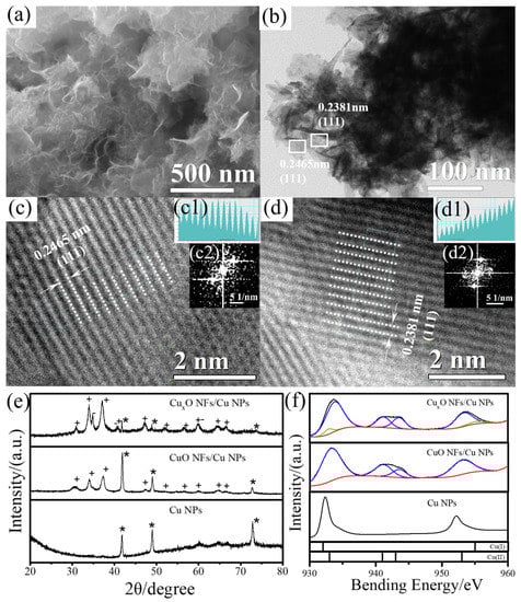 Images of (a) FESEM, (b) TEM, (c,d) HRTEM, (insert c1,d1) line profile and (insert c2,d2) FFT of CuxO NFs/Cu NPs nanocomposites. (e) XRD patterns (the signs of “*”, “+”,”−” represent the phase of “Cu”, “CuO”, “Cu2O”, respectively) and (f) XPS Cu 2p spectra of Cu NPs, CuO NFs/Cu NPs nanocomposites and CuxO NFs/Cu NPs nanocomposites.