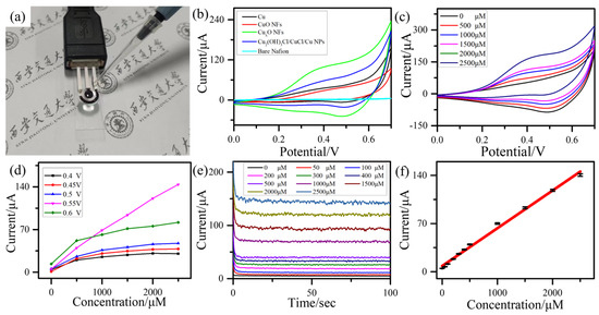 (a) Optical images of electrochemical measurement. (b) CV curves of different samples with 1.0 mM glucose concentration. (c) CV curves of CuxO NFs/Cu NPs nanocomposites-based sensor with increased glucose concentration. (d) the extracted calibration curves of a current response versus the glucose concentration at different potentials from +0.4 V to +0.6 V. (e) Amperometric responses with increased glucose concentration on +0.55 V. (f) The extracted currents upon different concentrations and corresponding calibration curves.