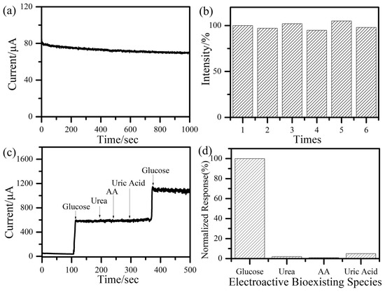 (a) The amperometric response with 1.0 mM glucose for 1000 s. (b) normalized amperometric response during the repeating test. (c) amperometric response of the sensor during consecutive addition of interference chemicals at +0.55 V. (d) normalized response of interferences.
